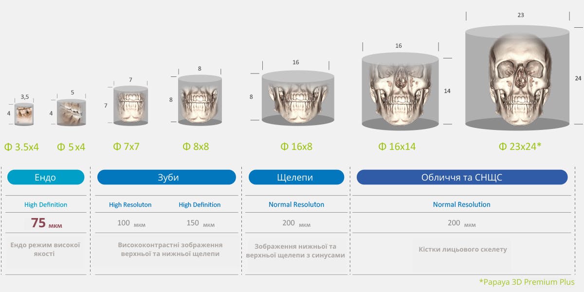 Апарат в стандарній комплектації оснащується зоною сканування 16×14 см. Також є молодша модель апарату із зоною сканування 16х8 см. Найстарша версія апарату Papaya 3D Premium plus має найбільшу зону сканування 23х24 см